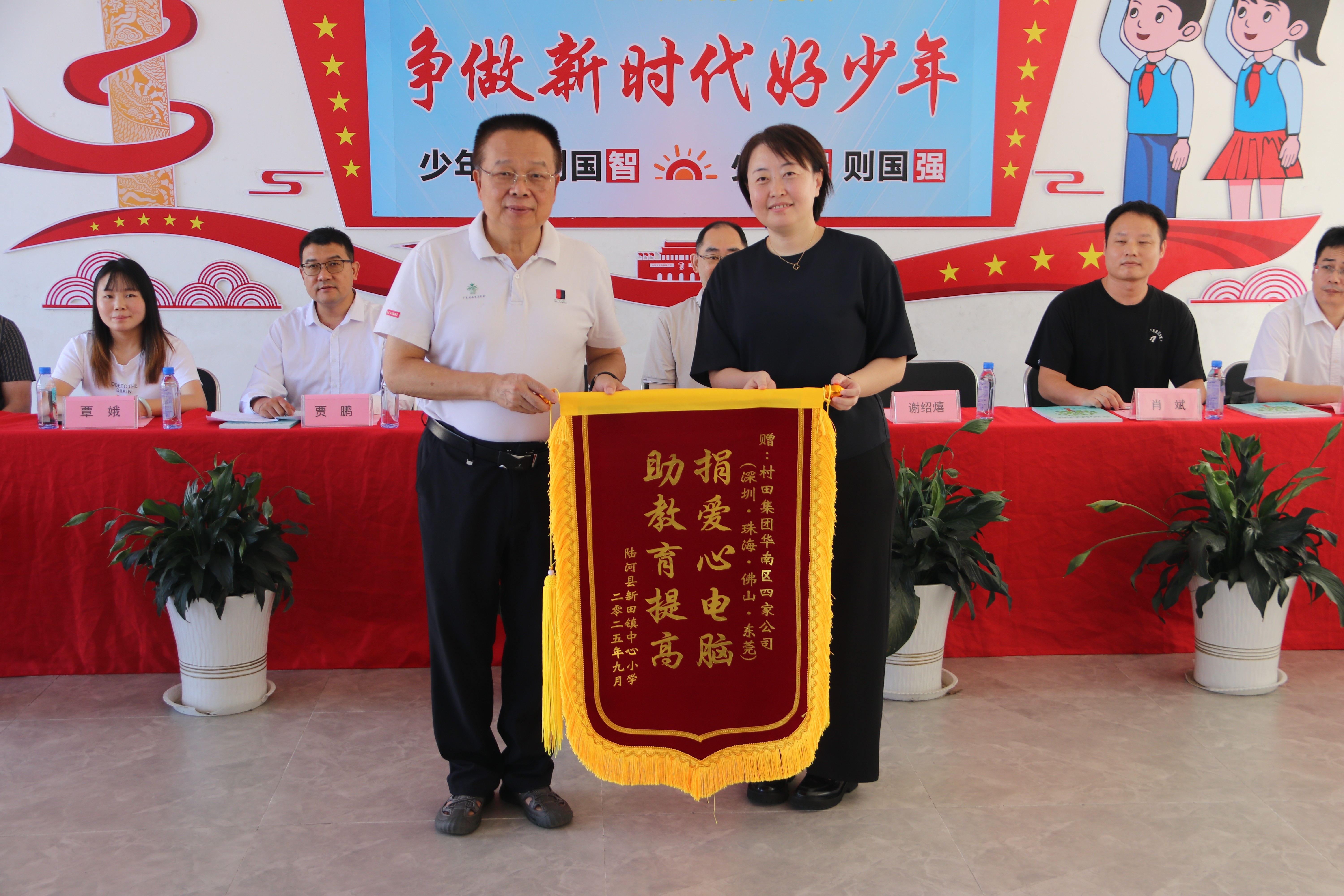村田集团华南区代表肖斌先生向陆河县新田镇中心小学赠送“绿色爱心电脑教室”牌匾